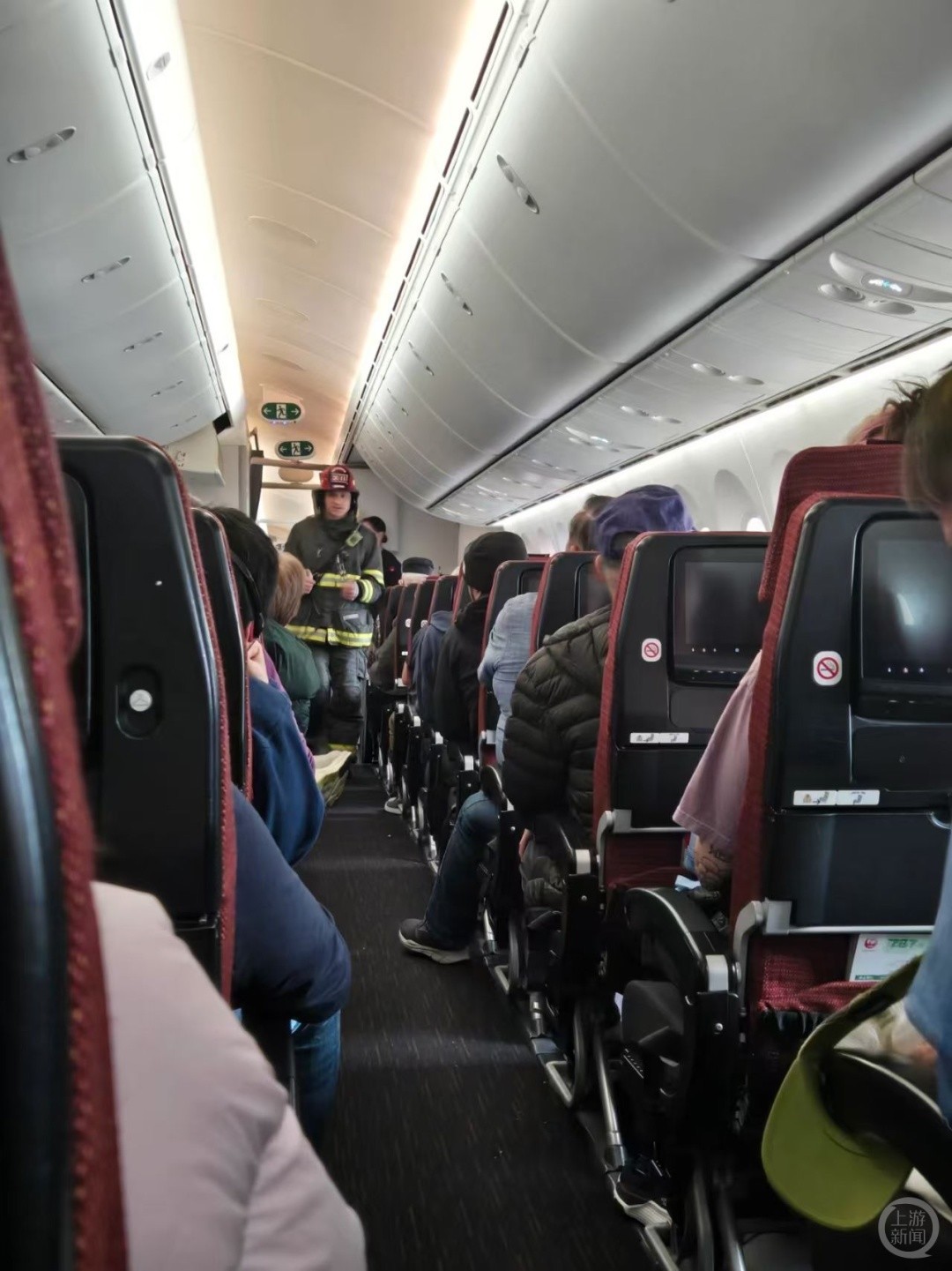 飞机发生碰撞之后,相关安全人员在飞机中查看情况。/受访者供图小琳说,飞机发生碰撞之后,飞机广播告诉大家飞机撞了,具体下机时间待定,估计需要等待较长的时间,“之后我们就是一直等啊等啊,看到消防车还有一些载人巴士陆陆续续赶到。在飞机上面等待了两个多小时后,机上乘客终于可以下飞机,机场方面安排了载人巴士将乘客们送到了海关大楼。”小琳告诉上游新闻记者,在办理完入境手续之后,等行李又等了近2小时。